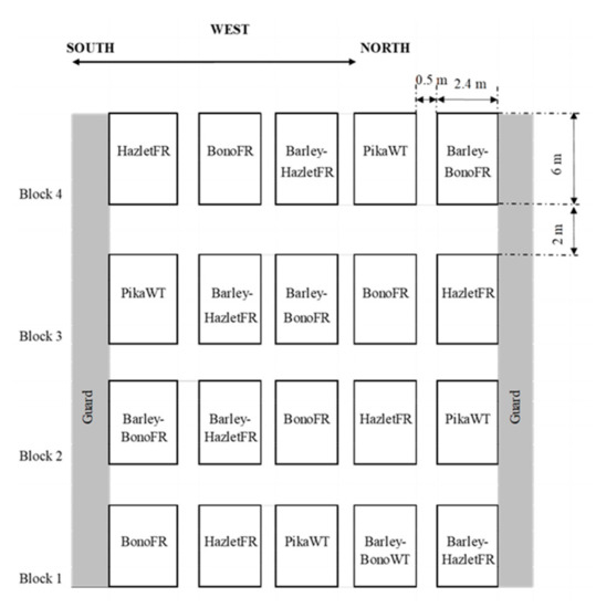 Experimental field layout of trial. Note: BonoFR, fall rye cv. Bono; HazletFR, fall rye cv. Hazlet; PikaWT, winter triticale cv. Pika; Barley-BonoFR, double cropping treatment of spring barley (cv. Maverick) followed by BonoFR; Barley-HazletFR, double cropping treatment of spring barley followed by HazletFR.