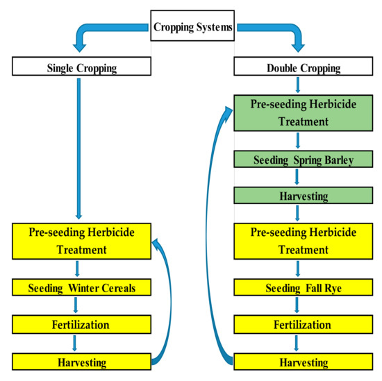 A flowchart showing the sequence of the work both in single and double cropping systems. Green box represents barley and yellow box represents winter cereals agronomics.
