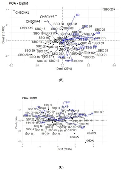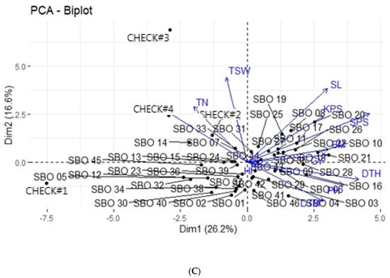 Under the DS and low N conditions, the percentage of variation accounted for by dimension 1 (Dim 1) and Dim 2 axes were 26% and 17% (Figure 1A), whereas the total variation at 100 and 200 kg N ha−1 were 44% and 43%, respectively (Figure 1B,C). Genotypes SBO 16, SBO 33, SBO 27, SBO 26, SBO 18, SBO 22, SBO 19 and SBO 24 were located furthest from the point of origin in the positive direction and positively correlated with traits GY, BM, DTM and PH (Figure 1A). Genotypes SBO 40, SBO 04, SBO 29, SBO 08, SBO 11, SBO 35, SBO 37, and SBO 07 exhibited the closest position to the biplot origin; these genotypes had yields close to the overall mean yield, as indicated in Figure 1A. The following genotypes were positively correlated with traits closer to them: SBO 16 (GY), SBO 19 (BM), SBO 03 (DTM), SBO 30 (PH and KPS), SBO 11 (TSW), SBO 15 (SL and SPS), SBO 13 (DTH), SBO 0166 (TN), SBO 07 (SE) and SBO 10 (HI) under DS and 50 kg N ha−1 (Figure 1A). Under 100 and 200 kg N ha−1, genotypes SBO 19, SBO 26 and SBO 01 were inclined in the direction of the BM, SPS and GY traits and had above-average yields and were located on the acute angle of Dim 1 (Figure 1B,C). All check genotypes occupied a negative angle of Dim 2 on the biplots, indicating a negative correlation with most evaluated traits, especially check#1, which was the furthest of them all across the treatment combinations, as shown in Figure 1A,C. Other genotypes remained strongly positively correlated with traits closer to them.