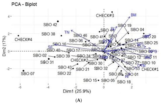 Figure 2 shows the percentage of variation accounted for by Dim 1 and Dim 2 under the NS conditions and at different N levels. Each treatment combination contributed 43%, 40% and 40% to the total variation, respectively (Figure 2A–C). Genotypes located on the positive angle of Dim 2 showed a strong positive correlation with traits closer to them. Hence, genotypes SBO 20, CHECK#3, SBO 45, SBO 09 and SBO 44 were inclined more in the direction of GY, BM, SPS, KPS and SL under NS (Figure 2A). Genotypes SBO 03, SBO 29, SBO 34, SBO 35 and SBO 36 showed broad adaptability, as they were located closer to the centre of the biplot, while genotypes SBO 04, SBO 14 and SBO 25 had above-average yields and were located on the acute angle of Dim 1 (Figure 2A). Under the NS conditions, genotypes SBO 16, SBO 42 and SBO 04 were inclined in the positive direction of the SPS, KPS and GY traits, which indicated a strong positive correlation and were selected as high-yielding genotypes (Figure 2B,C). All the check genotypes occupied the furthest negative direction from the point of origin and had below-average yields under NS (Figure 2A,B). However, the checks exhibited the closest point to the centre of origin and had an average grain yield under the NS conditions, as indicated in Figure 2 (200 kg N ha−1). Most genotypes were located closer to the centre of origin and had average grain yields.