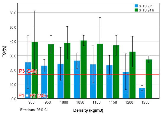 Thickness swelling (TS) after 2 and 24 h of the experimental panels and the minimum requirements of the European standards [33].