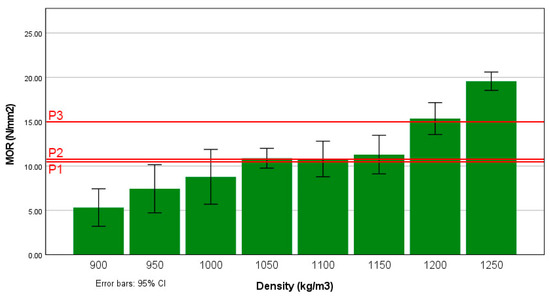 Modulus of rupture (MOR) results of the experimental panels and the minimum requirements of the European standards [33].