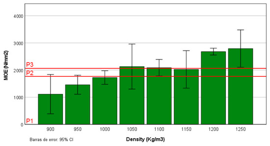 The MOE test results had a large deviation for some of the types; however, a trend can be inferred from the figure. Type 900 had a MOR value of 1113 N/mm2, whereas Type 1250 had a value of 2792 N/mm2. According to the results, density had a great influence on the MOE results.