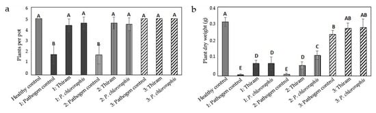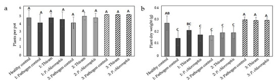 The plant dry weight was much more affected than the plant number (Figure 2b). Compared to uninoculated substrate, it was drastically reduced in the pots with even distribution of the inoculum (variant 1) and in pots with inoculum present in the upper half (variant 2). In these variants, seed treatment with thiram and P. chlororaphis caused a significant increase in plant dry weight, although the effect was much lower than on plant number, and the resulting dry weight was still clearly lower than in the healthy control. The plant dry weight of the pathogen control of variant 3 (inoculum only in lower half of pots) was significantly reduced compared to the healthy control by about 23%, which was, however, much less than in variants 1 and 2, where the reduction was more than 95%.