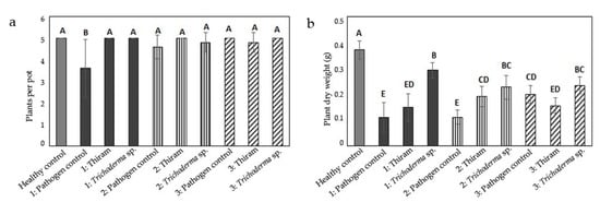Compared to the healthy control, inoculation of the potting substrate with R. solani caused a reduction in the number of plants in variant 1 only (Figure 3a), whereas the plant dry weight was significantly reduced in all variants and treatments (Figure 3b). With about −70%, the reduction was most pronounced in the pathogen controls of variant 1 and variant 2, and significantly larger than in the pathogen control of variant 3 (−46%) (Figure 3b and Figure S1). Seed treatment with thiram caused a significant increase in plant dry weight over the pathogen control in variant 2 only. After seed treatment with Trichoderma sp., the plant dry weight was significantly increased in variant 1 (R. solani inoculum evenly distributed in pot volume) and variant 2 (inoculum only in upper half of pots), but not in variant 3 (inoculum only in lower half of pots).