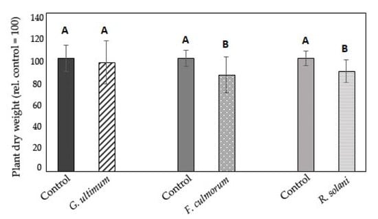 When plants were pre-cultured for 5 days in a layer of non-inoculated substrate and thereafter transferred onto inoculated substrate and further cultivated for 9 days, the plant dry weight was unaffected in the substrate inoculated with G. ultimum, but significantly reduced in the pots inoculated with F. culmorum and R. solani (Figure 4). The habitus of plants was visibly affected (Figure S2).