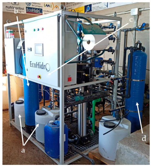 Picture of the experimental on-farm ion exchange resin system: (a) HCl and NaOH tanks; (b) zeolite and pyrolusite bed filter; (c) control panel; (d) ion exchange resin column.