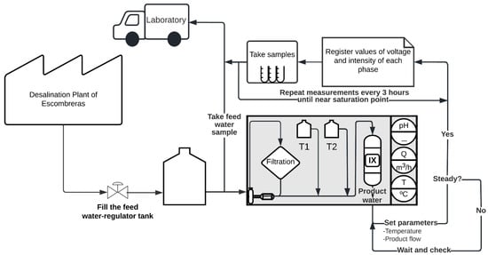 In order to characterize the effect of the resin on the reduction in boron and other ions in the DSW, samples of the feed and the effluent water were taken at the beginning of the trial and then after every 3 h of operation. A total of 106 water samples per trial were collected in 500 mL glass bottles, transported in an icebox to the laboratory and stored at 5 °C before being processed for physical and chemical analyses. An inductively coupled plasma (ICP-MS Agilent Technologies, Model 7900, Santa Clara, CA, USA) was used to determine the concentration of Na+, K+, Ca2+, Mg2+ and B3+. Anions (Cl−, NO3−, PO43− and SO42−) were quantified by ion chromatography with a liquid chromatograph (Thermo Scientific Dionex, Model ICS-2100, Thermo Scientific, Basel, Switzerland). The electrical conductivity of the water (EC) was determined by means of a conductivity instrument, GLP-31 (Crison Instruments S.A., Barcelona, Spain). The pH was measured with a pH meter, GLP-21 (Crison Instruments S.A., Barcelona, Spain). The boron reduction was calculated as follows:
