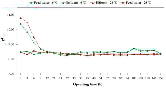 pH of the feed water and effluent during the tests performed.