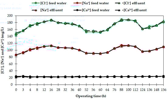 [Cl−], [Na+] and [Ca2+] in the feed water and effluent during the tests performed at 26 °C.