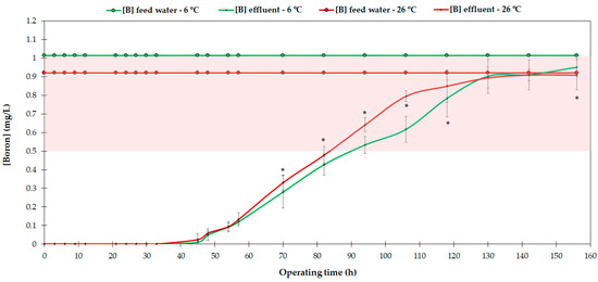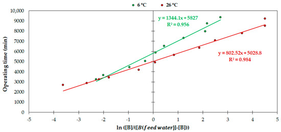 Figure 6 shows that the resin reached 50% of its saturation capacity after 5827 and 5028.8 min of operation, which means a volume of 2207 and 1905 Ltreated/Lresin, for the 6 and 26 °C trials, respectively. This also indicates that AmberLiteTM PWA10 achieved an apparent higher saturation rate as the temperature increased. These adsorption results are similar to those of other resin studies. For example, Chillón et al. [7] studied the boron removal behavior of Amberlite IRA 743, Purolite S-108 and Dow XU-43594.00, which kept the boron concentration of the effluent below 0.5 mg/L over 75, 71 and 66 h, retaining 1.9, 2.0 and 2.0 g B/Lresin, respectively, compared to the average of 88 h achieved by AmberLiteTM PWA10 and the maximum adsorption of 2.2 g B/Lresin found in our study (Figure 5). Several authors showed similar results for various resins [24,31,32]. However, as mentioned previously, others observed the contrary effect, i.e., decreased adsorbed boron as the temperature increased [12,46], which points to the fact that the relationship between the operating temperature and the adsorption of boron also depends on each resin. In any case, it must be highlighted that there were differences in operating conditions (bed volume, flow rate or boron concentration in the feed water) between our study and other studies; hence, comparisons need to be contextualized.