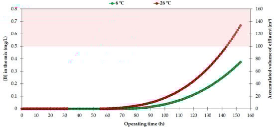 As Figure 7 shows, the concentration of boron in the accumulated volume would not exceed 0.5 mg/L for the following scenario: flow rate = 1 m3/h, operating time = 156 h, temperature 6–26 °C, feed boron concentration ≈1 mg/L, except for the last 12 h of operation at 26 °C. This would allow fewer regeneration treatments, since the resin does not require continuously being in a lower saturation state, and its molecular structure should not be harmed.