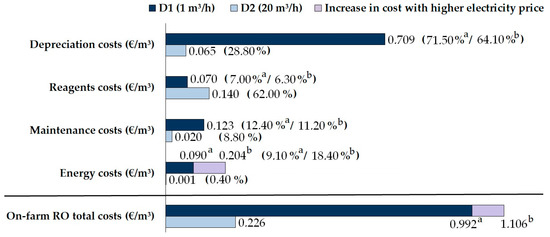 The costs of the studied on-farm boron reduction system, D1, and the scaled-up system, D2, are summarized in Figure 8. The depreciation costs depended mainly on the type of resin selected and on the scale of the equipment [39]. D1 showed a depreciation cost of EUR 0.709/m3 (EUR 4963/year), whereas D2 showed a lower depreciation cost of EUR 0.065/m3 (EUR 9100/year). The reagent costs were principally influenced by the amount of HCl and NaOH needed to regenerate the resin and the number of regenerations performed, which mainly depended on the volume of resin in the column, the boron concentration in the feed water, the flow rate established and the passage of operating time. In this case, reagent costs were EUR 0.070/m3 (EUR 490/year) and EUR 0.140/m3 (EUR 19,600/year) for D1 and D2, respectively. The costs for D1 considered a regeneration procedure every 50 h. Great variability in terms of the cost of reagents has also been observed depending on the type of reagents used for regeneration [49], and the resin itself [39]. Nevertheless, optimization of the used reagents considering a regeneration every 156 h in D1 (Figure 7) diminished the cost to EUR 0.022/m3 (EUR 154/year). Furthermore, this management would also avoid the need to supply boron during the reconditioning of the water produced for irrigation, since DSW is highly demineralized [2] during the desalination process at coastal plants. The maintenance costs decreased from EUR 0.123/m3 (EUR 861/year) in the case of D1 to EUR 0.020/m3 (EUR 2800/year) in the case of D2.