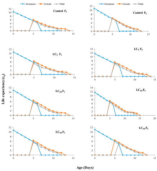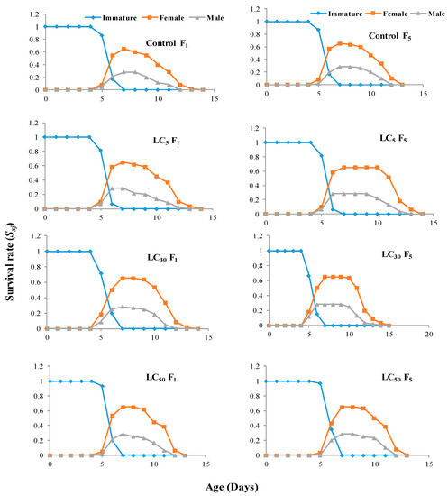 Sublethal (LC5), low lethal (LC30), and median lethal (LC50) concentrations of imidacloprid including control (acetone) were applied to investigate the effects on the demographic traits of T. chilonis adults for five continuous generations (F1 to F5). The demographic traits of T. chilonis were assessed by the method suggested by Del Pino et al. [47] under standard laboratory conditions (temperature 25 ± 1 °C; relative humidity 70 ± 5%; and 14 h light: 10 h dark)