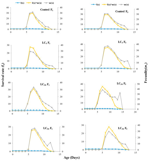Age–specific survival rate (lx), age–specific fecundity of total population (mx), and age–specific maternity (lxmx) of T. chilonis adults of imidacloprid in F1 and F5 generations.
