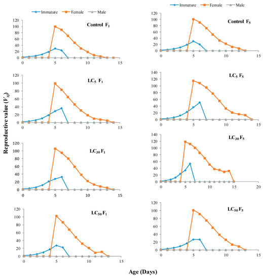 Age–stage–reproductive value (vxj) of T. chilonis adults treated with acetone and LC5, LC30, and LC50 concentrations of imidacloprid in F1 and F5 generations.