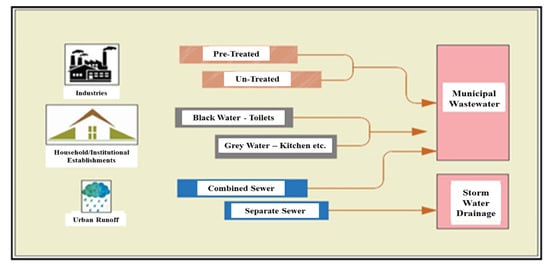 Wastewater refers to the water polluted and degraded by several forms of waste coming from homes, industries, agriculture, and other resources [43,44]. Domestic wastewater mostly includes household materials, while industrial wastewater includes food pulps, papers, pharmaceuticals, chemicals, and heavy metals enriched with organic and inorganic contents [45]. However, it can be reused or reutilized in irrigation, industrial usage, or even for drinking by eliminating pollutants, and it is called reclaimed or recycled water. Furthermore, this wastewater contains many dissolved and suspended solids that can be classified based on the source, such as black, gray, and storm. Different sources of wastewater are shown in Figure 1.
