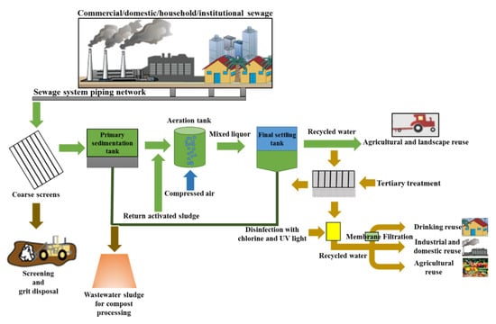 Primarily in wastewater treatment, suspended and heavy materials are removed by using meshes through the settling process, and then the effluent is transferred for the secondary treatment-settlement process, which is used for the degradation of organic compounds to settable products allowed to settle down for further treatment. This secondary effluent can be discharged to natural waterways if further disinfection and advanced treatment are unavailable. Otherwise, the secondary effluent would be disinfected and treated but unqualified for direct or domestic use without tertiary, as shown in Figure 2. Tertiary treatment involves an advanced mechanism to separate the effluent from volatile fatty acids, dissolved solids, and macro- and micropollutants, including a higher degree of disinfection against infectious pathogens [59]. The tertiary effluent should be disinfected before discharge or reuse.