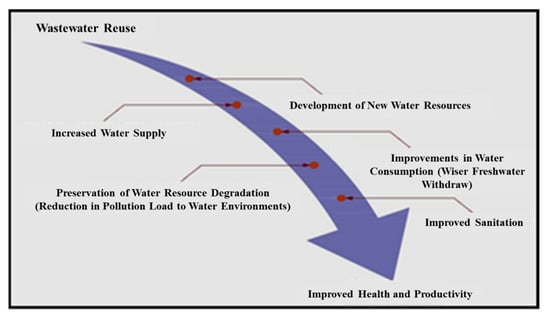Reclaimed water can be a better source of multiple nutrients and organic matter than chemical fertilizers. Reclaimed water is essential for plant growth, as it is rich in several micronutrients, such as Mn, Co, Fe, Cu, Zn, and Mo. Approximately 1000 cubic meters of RW is used for the irrigation of the land of 1 hectare, which may provide nitrogen, phosphorus, potassium, calcium, magnesium, and sodium with 16–62, 4–24, 2–69, 18–208, 9–110, and 27–182 kg, respectively [90]. Thus, these nutrients required by the crops present in the RW can reduce the pressure on farmers to use the expensive chemical fertilizers and reduce the cost of production. To offset the P requirement of crops in P-deficient farm soils, the excreta and RW can be used [91]. However, it should be noted that the excessive N quantities in wastewater may cause excessive vegetative growth, favoring the insect/pest attacks, crop lodging, and unwanted ripeness, and this may reduce the crop quality [90,92]. Higher concentrations of trace metals may result in plants being unsafe for the consumer and may risk human health [42]. The prospects of the reuse of wastewater protecting environmental health risks are shown in Figure 3.