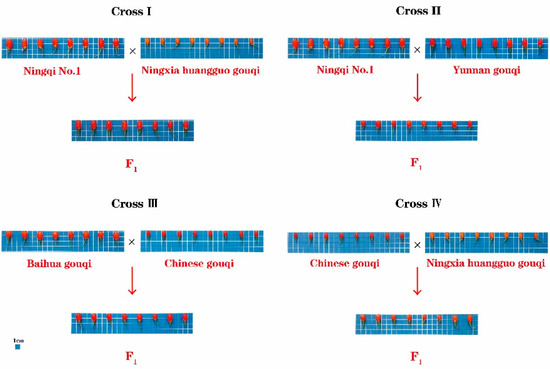 - Yin, Y.; Zhao, J.H.; He, X.R.; Liang, X.J.; An, W.; Qin, X.Y.; Cao, Y.L. Hybrid identification and genetic analysis in wolfberry F1 population using SSR markers. Acta Agric. Boreali-Occident. Sin. 2019, 28, 2027–2034. (In Chinese) [Google Scholar]