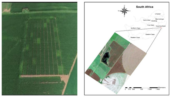 The field trial (Figure 1) was established by the KwaZulu-Natal Department of Agriculture and Environmental Affairs in Winterton Bergille, (KwaZulu-Natal Province, South Africa) during the 2003–2004 growing season. The aim was to investigate the effects of different cropping systems on soil fertility, pests, and diseases in the long term. The farm, Grouton Farm, is situated at 28°55′26.83″ S, 29°33′38.64″ E, and 1038 m above sea level. In KwaZulu-Natal Province, the greatest percentage of dryland maize is produced in this area for commercial production. More rainfall is received in summer between October and March and annually, the average rainfall is 643 mm, while the average air temperature is 19.3 °C and 27.9 °C in June and January, respectively. Table 1 below shows the temperature and rainfall received during the time of experimentation. The soil is classified as Hutton non-swelling with a clay loam soil texture [26].