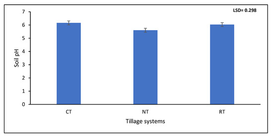 Soil pH at three different tillage treatments of no-till (NT), rotational tillage (RT), and conventional tillage (CT) after 17 years of trial establishment.