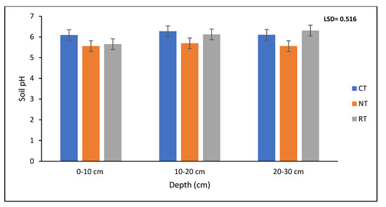 Soil pH at three different sampling depths (0–10, 10–20, 20–30 cm) after 17 years of trial establishment. CT = conventional tillage, RT = rotational tillage, NT = no-till.