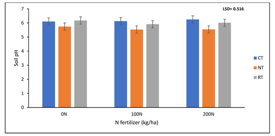 Soil pH at three different N fertilizer levels (0, 100, 200 kg/ha) after 17 years of trial establishment. CT = conventional tillage, RT = rotational tillage, NT = no-till.