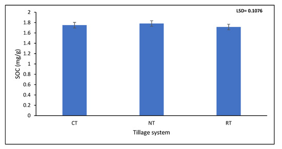 Soil organic carbon (SOC) at three different tillage treatments of no-till (NT), rotational tillage (RT), and conventional tillage (CT) after 17 years of trial establishment.