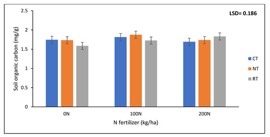 Soil organic carbon (SOC) at three different N fertilizer levels (0, 100, 200 kg/ha) after 17 years of trial establishment. CT = conventional tillage, RT = rotational tillage, NT = no-till.