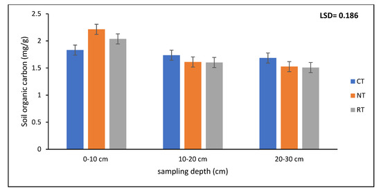 No significant differences (p > 0.05) were found in soil organic carbon (SOC) between different tillage treatments (Table 2 and Figure 5). Although not significantly different, SOC was slightly higher under NT (1.78 mg/g) compared to RT (1.72 mg/g) and CT (1.75 mg/g) (Figure 5). Similar trends were observed in N fertilizer application rates where there were no differences (p > 0.05) found between treatments in SOC with the increase in N fertilizer application rate (Figure 6). A significant difference (p < 0.05) was observed in SOC when comparing depths (Table 2). The 0–10 cm depth of reduced tillage treatments (NT and RT) had significantly (p < 0.05) higher SOC compared to 10–20 and 20–30 cm depths (Figure 7). Conventional tillage on the other hand had uniform (p > 0.05) SOC across the treatment depths. In addition, no differences (p > 0.05) were found in all tillage treatments in the 10–20 and 20–30 cm depths (Figure 7).