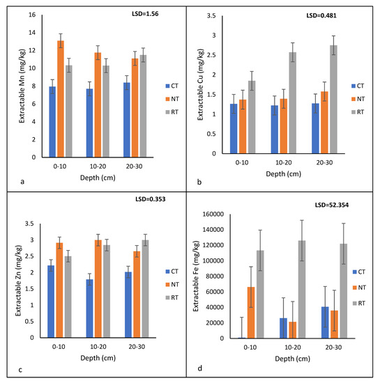 The concentration of Mn in the no-till at the 0–10 cm depth was found to be higher than at the 10–20 and 20–30 cm depths (Figure 9a). In RT treatment, the concentration of Mn was found to be similar in the 0–10 and 10–20 cm depths with a slight increase in the 20–30 cm depth. On the other hand, the Mn concentration was uniformly (p > 0.05) distributed in the CT treatment. Copper in NT and CT treatments was found to be distributed uniformly (p > 0.05) while in RT treatment it was significantly lower on the soil surface at 0–10 cm depth and increased with an increase in sampling depth (Figure 9b). The concentration of Zn was higher in the 0–10 and 10–20 cm depths as compared to the 20–30 cm depth (Figure 9c). In RT treatment it increased with depth while in CT treatment it was higher in the 0–10 cm depth and compared to the 10–20 and 20–30 cm depths (Figure 9c). Iron in NT treatment was higher on the soil surface at the 0–10 cm depth as compared to lower depths, while in RT treatment it showed no differences (p > 0.05) at different depths (Figure 9d). In CT treatment, no differences we found in Fe concentration although it was observed to be lower on the soil surface and increase with soil depth (Figure 9d).