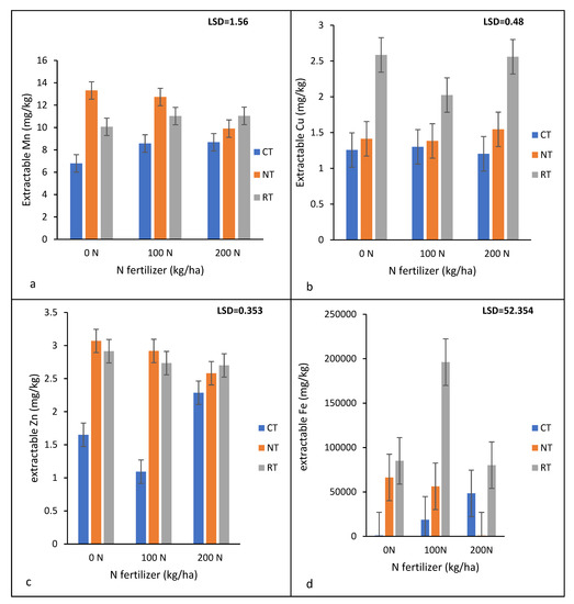 The concentration of extractable micronutrients [manganese (Mn) (a), copper (Cu) (b), zinc (Zn) (c) and iron (Fe) (d)] in three treatments of nitrogen (Urea) at 0, 100 and 200 kg/ha recorded after 17 years of trial establishment. N = nitrogen fertilizer. CT = conventional tillage, RT = rotational tillage, NT = no-till.