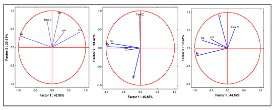 The results of the principal component analysis showed that factor 1 and factor 2 contributed 42.88 % and 29.51 % to the total variation of the four extractable micronutrients (Cu, Mn, Zn and Fe) as well as soil pH and total organic carbon under NT (Figure 11). Factor 1 and 2 of rotational tillage contributed 46.56% and 23.47%. Factor 1 and 2 of conventional tillage contributed about 44.16% and 19.92% to the variation of the aforementioned micronutrients, soil pH, and SOC. Vectors showed a clear separation of extractable Mn and Cu under RT and CT, but Fe and Zn showed indistinct separation. The results showed that the concentration of Cu, Mn, Fe, and Zn was defined by the pH of the soil together with total carbon under NT and CT, these observations are derived from the close proximity of pH and total carbon vectors to those of micronutrients. The results also found an unclear separation of Zn, Fe, Mn and Cu under rotational tillage, however, soil pH and total carbon were clearly separated to micronutrient vectors. This indicated that the concentration of these micronutrients was hardly defined by these variables.