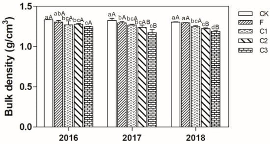 Effects of biochar on soil bulk density under soybean continuous cropping. Different lowercase letters indicate differences (p < 0.05) between the treatments in each year, and different capital letters indicate differences of the same treatment in 3 years. Bars represent standard errors (n = 3).