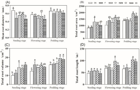 The application of biochar in the soybean seedling and flowering stages had a decreasing effect on the MRD over the course of plant development. The MRD of CK at the seedling stage was thicker than that of C3 and F, and at the flowering stage was 23.48% thicker than that of C3 (Figure 2A). Biochar significantly increased the TRA, TRV, and TRL of soybean. At the seedling stage, the TRA of C1 was 61.36% and 49.54% higher than that of CK and F, respectively. C3 inhibited root growth in soybean seedlings and that C2 promoted root growth in soybean at flowering and podding (Figure 2B). At the seedling stage, the TRV of the C1, C2, and C3 was significantly higher than CK and F. At the podding stage C2 was 31.91% and 25.77% higher than that of CK and F, respectively, and the TRV of C3 was 28.06% and 22.10% higher than that of CK and F, respectively (Figure 2C). At the flowering and podding stage, the TRL of C2 was significantly higher than that of the other treatments (Figure 2D).