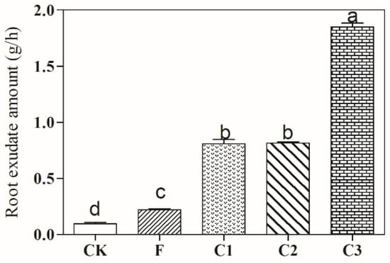 Biochar significantly increased soybean root exudation in a biochar application rate-dependent manner. The root exudate amount of C3 was significantly higher than that of the other treatments, with a value 19.82 times and 8.27 times that of CK and F, respectively (Figure 3).