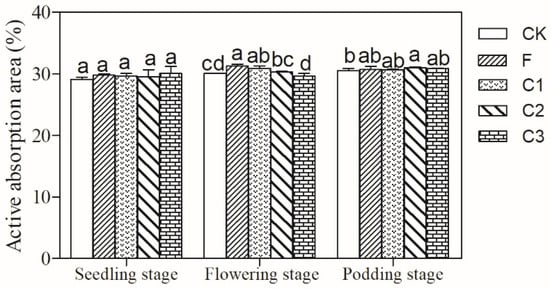 The RAAs of F and C1 were significantly higher than that of CK at the flowering stage, with values 3.90% and 2.59% higher than that of CK. At the podding stage, the RAA of C2 soybean was 1.60% higher than that of CK. This finding indicated that excessive biochar application (C3) had no significant effect on the RAA, and the appropriate application of biochar is particularly important (Figure 4).