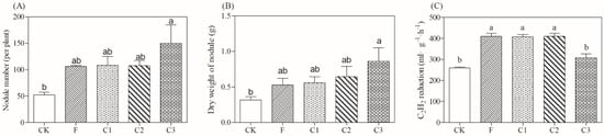 The number and dry weight of soybean nodules in different treatments showed the same trend: C3 had significantly higher values than CK (Figure 5B). The nodule number of C3 was 2.88 times that of CK, and the dry nodule weight of C3 was 2.78 times that of CK (Figure 5A). The results showed that the high application rate of biochar significantly promoted the growth of soybean nodules. The root nodule nitrogenase activity treated with biochar and fertilization was higher than that of the control. The root nodule nitrogenase activities of F, C2, and C1 were 1.71, 1.58, and 1.57 times that of CK, respectively. The root nodule nitrogenase activities of C2 and C1 were higher than those of C3, indicating that the promoting effect under the high biochar application rate was poor (Figure 5C).