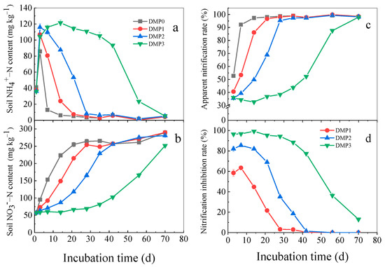 Apparent nitrification rate in all treatments showed an increasing trend. However, the time when reached to the maximum was significantly different. The time of reaching to the maximum in DMP0, DMP1, DMP2, and DMP3 was 7, 14, 35, and 70 days after incubation, respectively, which indicated that the apparent nitrification rate decreased significantly with the increasing of DMP. On the contrary, nitrification inhibition rate in DMP treatments showed a decreasing trend with a prolonged incubation period and an increasing application of DMP. The nitrification inhibition rate in DMP3 was the highest, significantly higher than that in DMP2 and DMP1. DMP2 was significantly higher than DMP1, and both decreased to 0 after 42 days. However, the nitrification inhibition rate in DMP3 still remained at approximately 15% on day 70 of incubation.