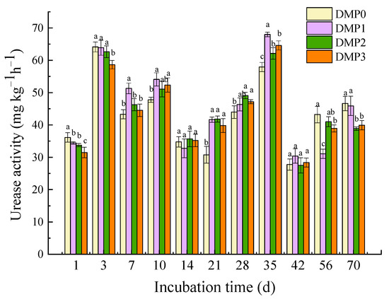 Soil urease is an obligate enzyme regulating the process of urea hydrolysis, which directly affects NH3 volatilization and N use efficiency. Figure 4 showed soil urease activity decreased significantly with DMP dose increasing on the 1st day of incubation. Additionally, on the third day, urease activity reached the first peak value, with only DMP3 having a significantly lower value compared with the DMP0 treatment (p < 0.05). Then, it showed a “decrease-increase-decrease” changing trend with the second peak value appearing on day 35. Additionally, urease activity in DMP treatments was generally higher than those in DMP0 from days 7 to 35 of incubation. After day 35, this value decreased again with some significant differences observed between DMP treatments and DMP0 on days 56 and 70. This result indicated that DMP had a temporally inhibitory effect on soil urease activity during the hydrolysis process of urea.