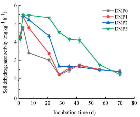 Soil dehydrogenase is a typical intracellular enzyme that directly indicates soil microbial growth and metabolism. Figure 7 shows that soil dehydrogenase activity (DHA) presented a peak on the third day. This value in DMP was significantly higher than that in DMP0 during days 3 to 21, and DHA increased significantly with the doses of DMP increasing (p < 0.01). After 3 days, DHA in all treatments showed a decreasing trend. Compared with DMP0 treatment, DHA in DMP3 was higher by 81.06% and 49.64% on 21 days and 42 days, respectively. In the later incubation period, DHA under DMP1 and DMP2 were also higher than DMP0, which was similar to the change of soil nitrite reductase activity. These results suggested DMP stimulated but did not affect total microbial activity.