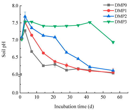 Soil pH, influencing directly soil enzyme activity and microorganism, was also significantly affected by the addition of DMP (Figure 8). Within the first 3 days, soil pH in all the treatments increased remarkably with urea hydrolysis, reaching a peak on the third day, then keeping a general decreasing trend. For the DMP3 treatment, soil pH was significantly higher than those in other treatments from 3–60 days of incubation, and it showed a slower decrease rate compared with that in DMP0. For DMP1 and DMP2, soil pH was also significantly higher than that in DMP0 during 3–30 days of incubation, then no significant differences were observed. In addition, the decreased rate of soil pH became slower with the increasing of DMP application rates. Soil pH at day 56 in DMP0 fell by 1.24 units compared with the initial pH of tested soil, while that in the DMP3 treatment was still greater by 0.91 units than that in DMP0. These results suggested that DMP application could increase soil pH effectively and maintain a high level for a long time.