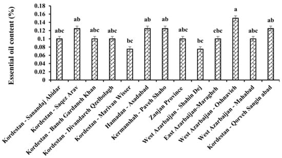The essential oil content of S. lavandulifolia populations from the west and northwest of Iran. Different letters indicate a significant difference at p < 0.05.