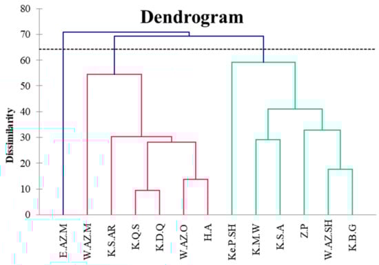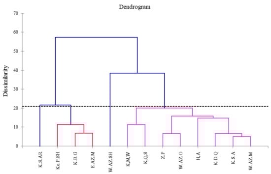 Dendrogram of cluster analysis for the essential oil compositional diversity of thirteen S. lavandulifolia populations from west and northwest Iran. The populations studied were K.S.AR (Kordestan-Saqez Arav), Ke.P.SH (Kermanshah-Paveh Shaho), K.B.G (Kordestan-Baneh Gardaneh Khan), E.AZ. M (East Azarbaijan-Maragheh), W.AZ.SH (West Azarbaijan-Shahin Dej), K.M.W (Kordestan-Marivan Wisser), K.Q.S (Kordestan-Qorveh Sangin Abad), Z.P (Zanjan Province), W.AZ.O (West Azarbaijan-Oshnavieh), H.A (Hamadan-Asadabad), K.D.Q (Kordestan-Divandareh Qezel Bolagh), K.S.A (Kordestan-Sanandaj Abidar), and W.AZ.M (West Azarbaijan-Mahabad).