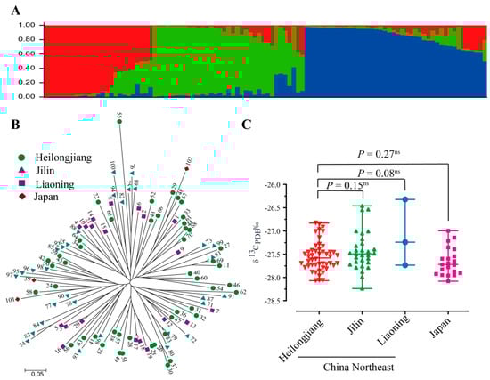 Natural variation in δ13C values in 102 rice accessions derived from different geographic regions. (A) Population structure analysis of 102 rice accessions. (B) Polygenetic analysis of 69 SSR markers in 102 rice accessions. (C) Distribution of δ13C in accessions originating from different geographic regions.