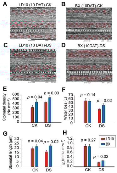 Furthermore, epidermal cell stomatal profilings were determined to analyze the potential effects on drought performance. Results show that the stomatal density and stomatal length in BX are 30% and 35% higher than those in LD10 under DS conditions (Figure 3A–D). In addition, the water loss calculated at the whole-plant level in BX was 33% higher than that in LD10 (Figure 3E). Stomatal conductance (gs) in BX was 11% higher than that in LD10 in DS condition (p > 0.05) (Figure 3F). In terms of DS effects, it induces up to 25% reduction in stomatal length, 40% reduction in water loss, and 350% reduction in stomatal conductance for both rice accessions (Figure 3E–H). In contrast, stomatal density was increased by 20% due to DS effects for both rice accessions (Figure 3C).