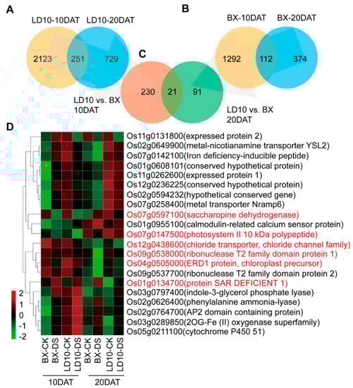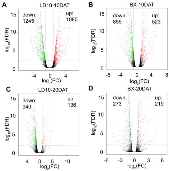 Furthermore, we found that there were 1080 and 523 upregulated genes in LD10 and BX at tillering stage (~10 DAT) induced by DS relative to CK, respectively (Figure 4A,B). There were 1245 and 855 downregulated genes induced by DS relative to CK in LD10 and BX at tillering stage, respectively (Figure 4A,B). At the graining stage (~20 DAT), there were 136 and 219 upregulated genes induced by DS relative to CK in LD10 and BX, respectively (Figure 4C,D). These findings suggest that more differentially expressed genes (DEGs) were identified in LD10 than in BX due to DS effects for both developmental stages (10 DAT and 20 DAT).