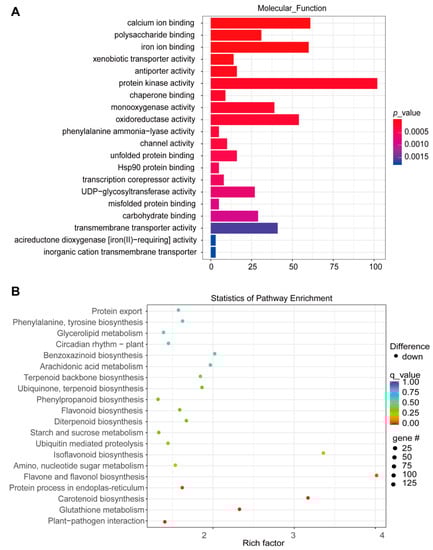 GO and KEGG analysis of upregulated genes in LD10 relative to BX at 10 DAT. (A) Molecular function extracted from GO analysis of the list of upregulated genes. (B) KEGG analysis of the list of upregulated genes.