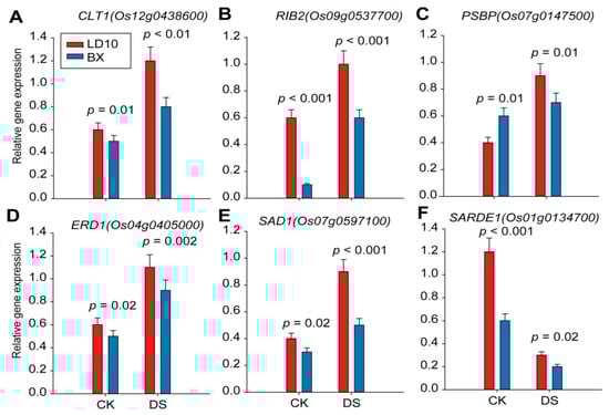 Furthermore, the expression levels of 6 out of 14 DRGs were examined using qRT-PCR, and we found that CLT1, PSBP, ERD1, SAD1, and RIB2 genes show greater upregulation by DS in LD10 than in BX at 10 DAT (Figure 7A–E). In contrast, SARDE1 shows a greater scale of downregulation by DS in BX than in LD10 across two stages (Figure 7F). These findings suggest that CLT1, PSBP, ERD1, SAD1, and RIB2 are probably positive regulators, while SARDE1 is a negative regulator responsible for drought tolerance.